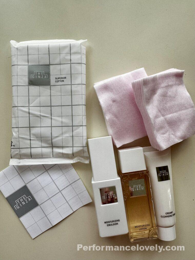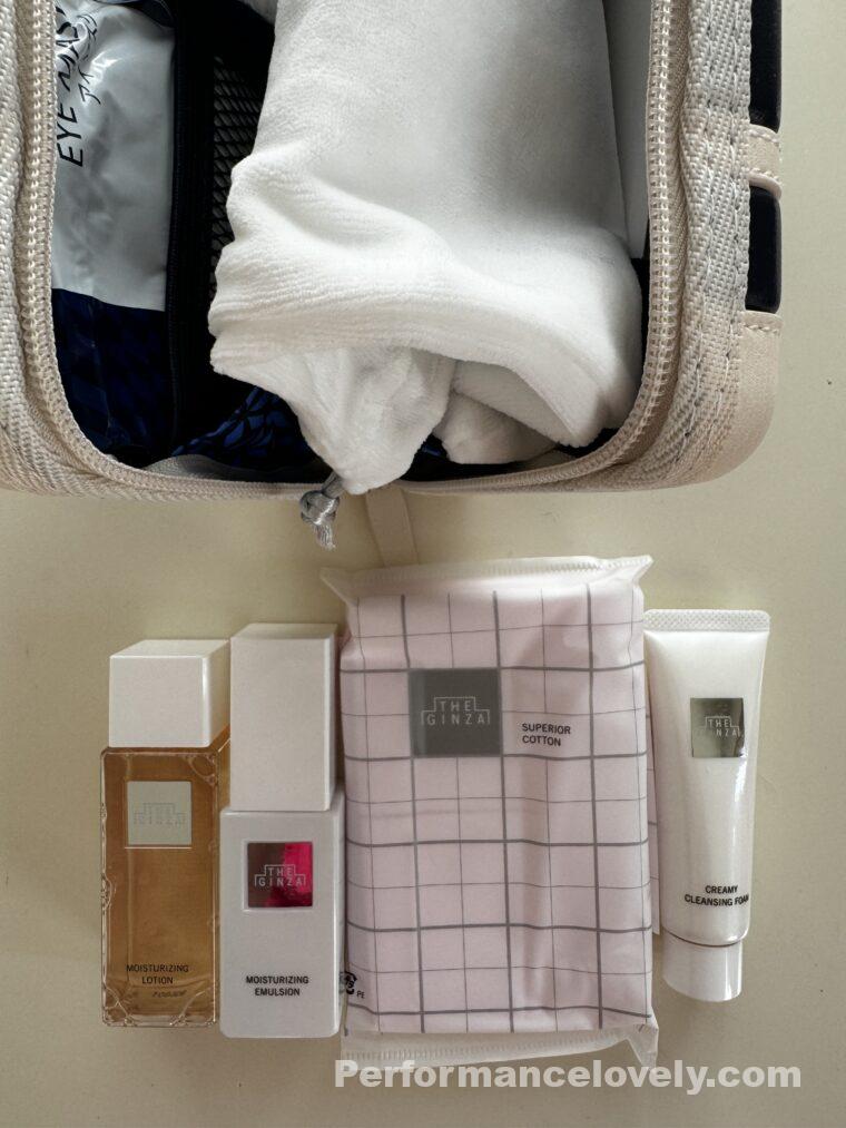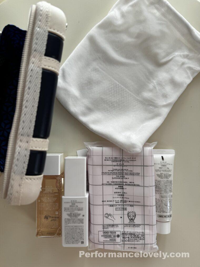 なかにはアイマスク、イヤープラグと資生堂:ザ・ギンザのスキンケアセットが入っています。