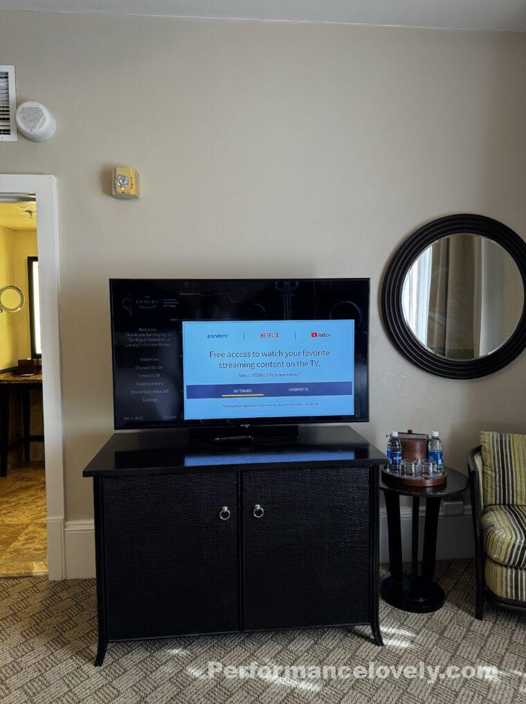 ベッドの向かいにテレビがありました。テレビはお部屋に入ると、オンになっている状態で、チャンネルの案内と音楽が静かに流れていました。