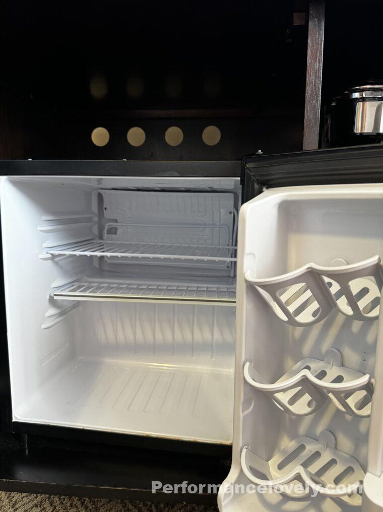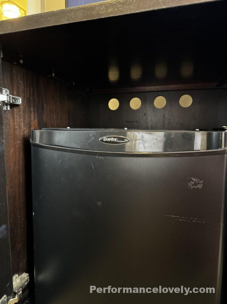 テレビの下の扉を開けると冷蔵庫があります。小さめの黒い冷蔵庫です。
