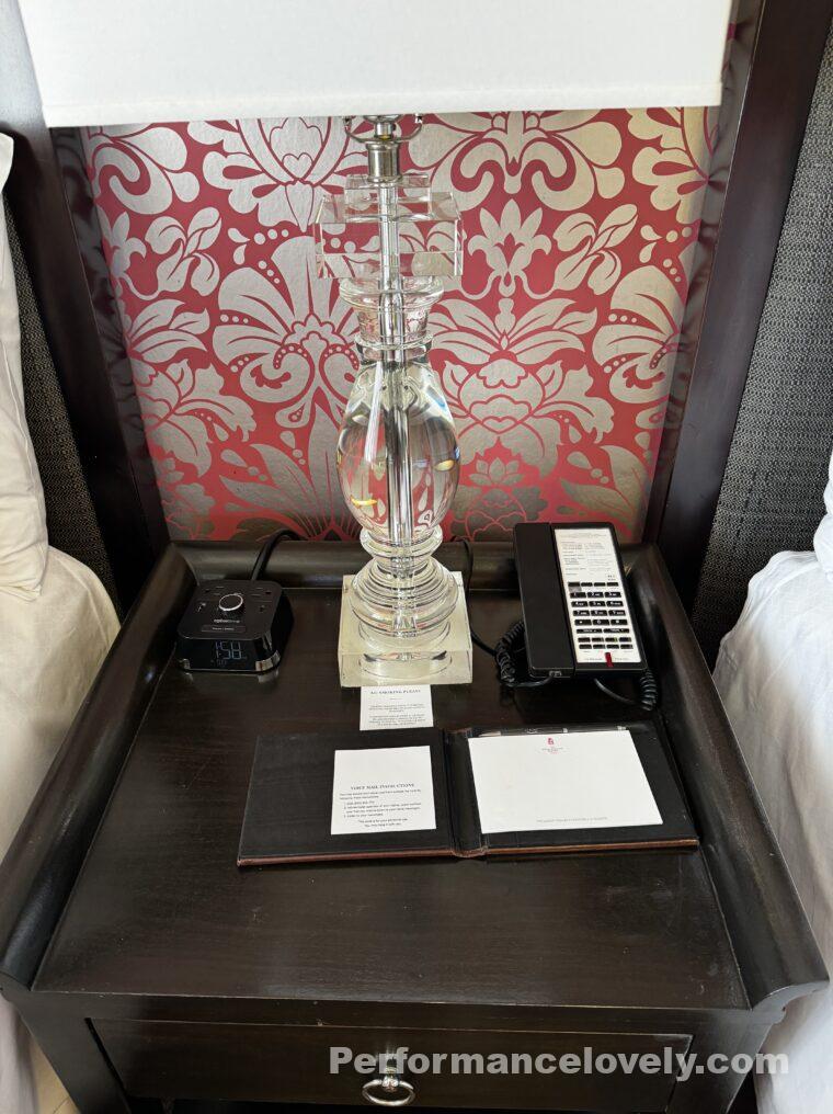 ベッドサイドテーブルの上には電話機とメモ帳のセット、充電ポートがあります。