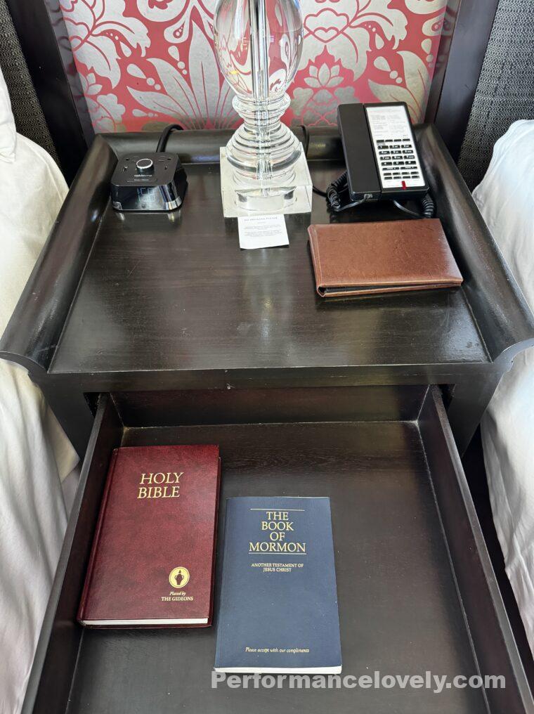 ベッドサイドテーブルの引き出しのなかには聖書がありました。