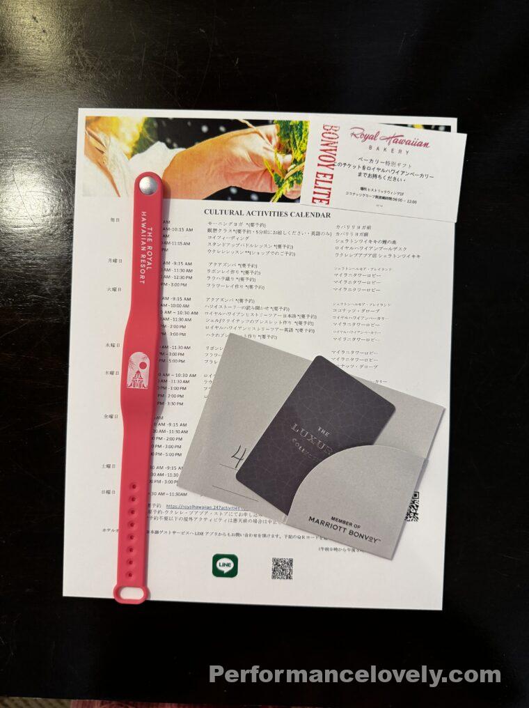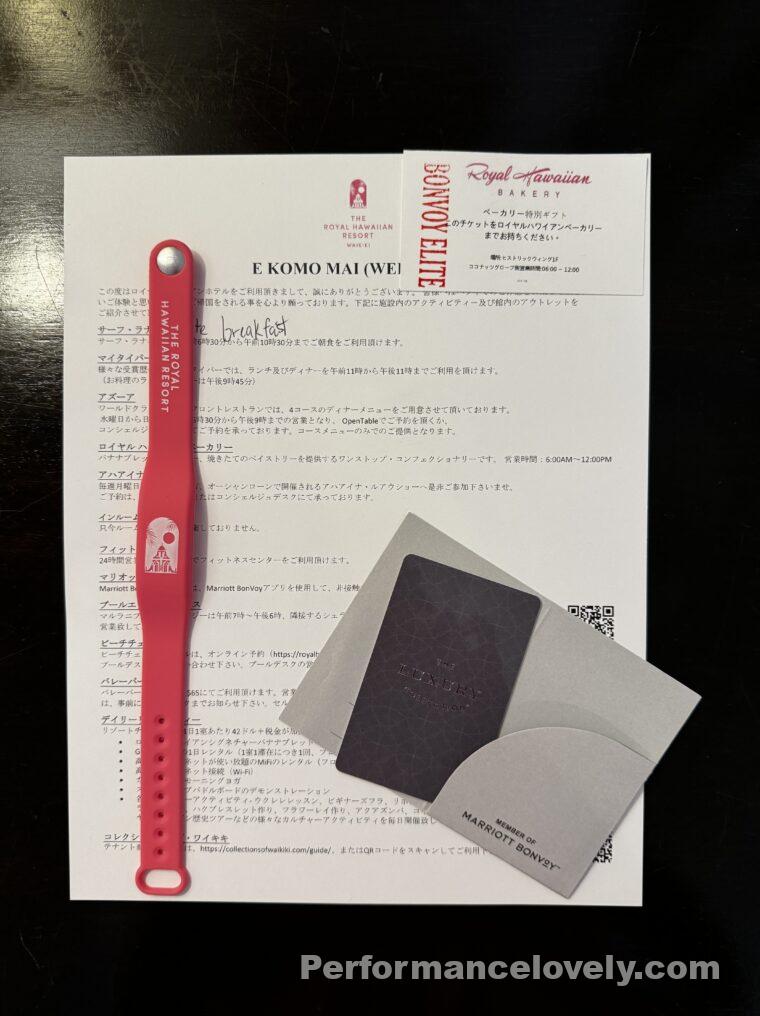チェックインのときにいただいた案内とカードキー、リストバンド型のキーです。