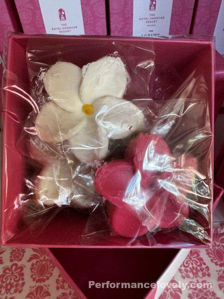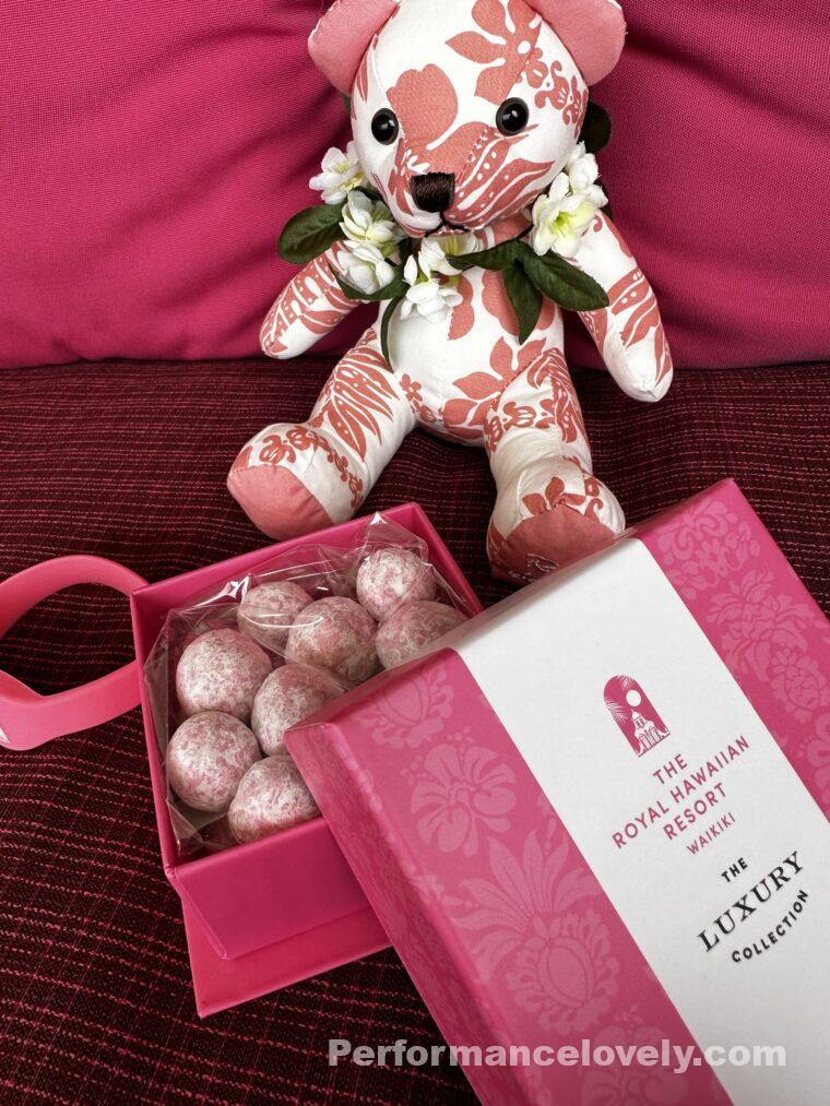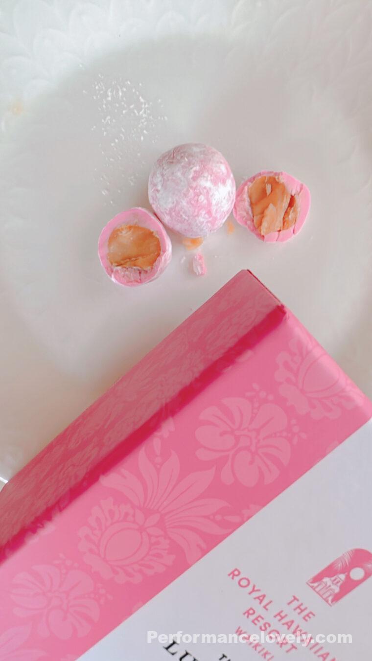 こちらもホテルのロゴ入りボックスに入ったピンクマカダミアナッツです。マカダミアナッツにピンクのチョコレートがコーティングされています。