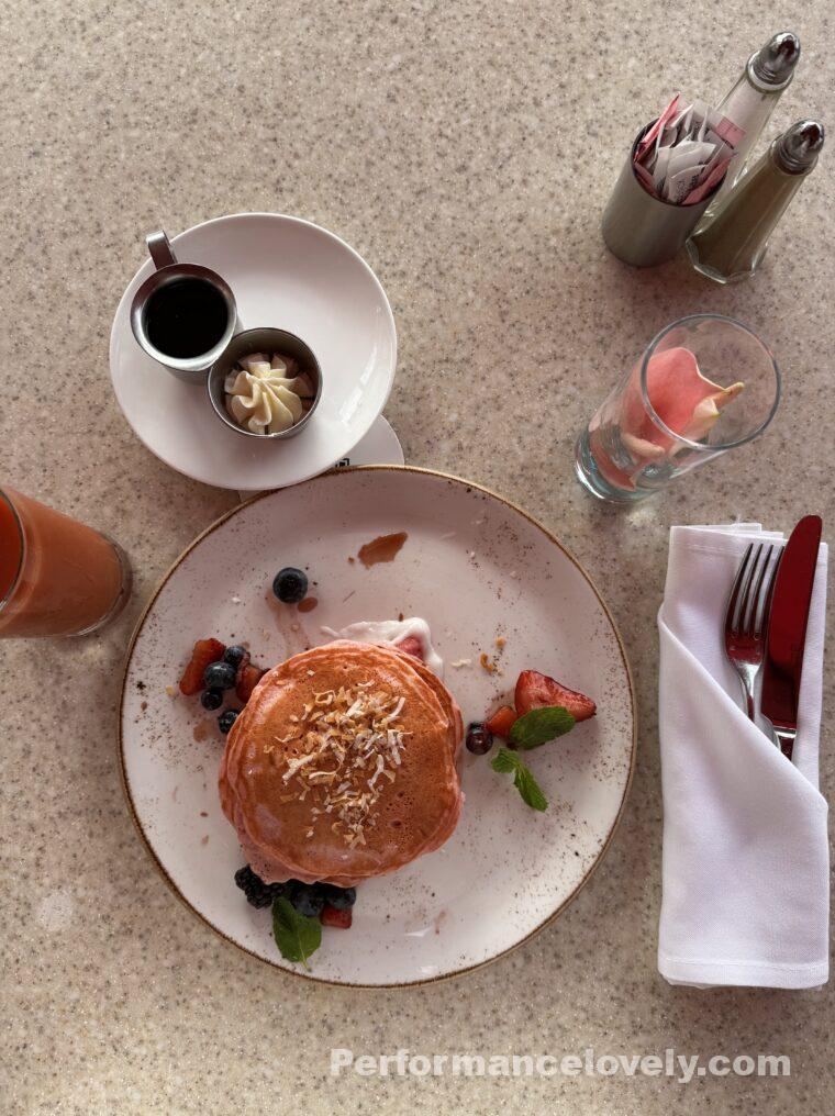 こちらがロイヤルハワイアンにあるレストラン、サーフラナイで朝食のときにいただいたピンクパレスパンケーキです。