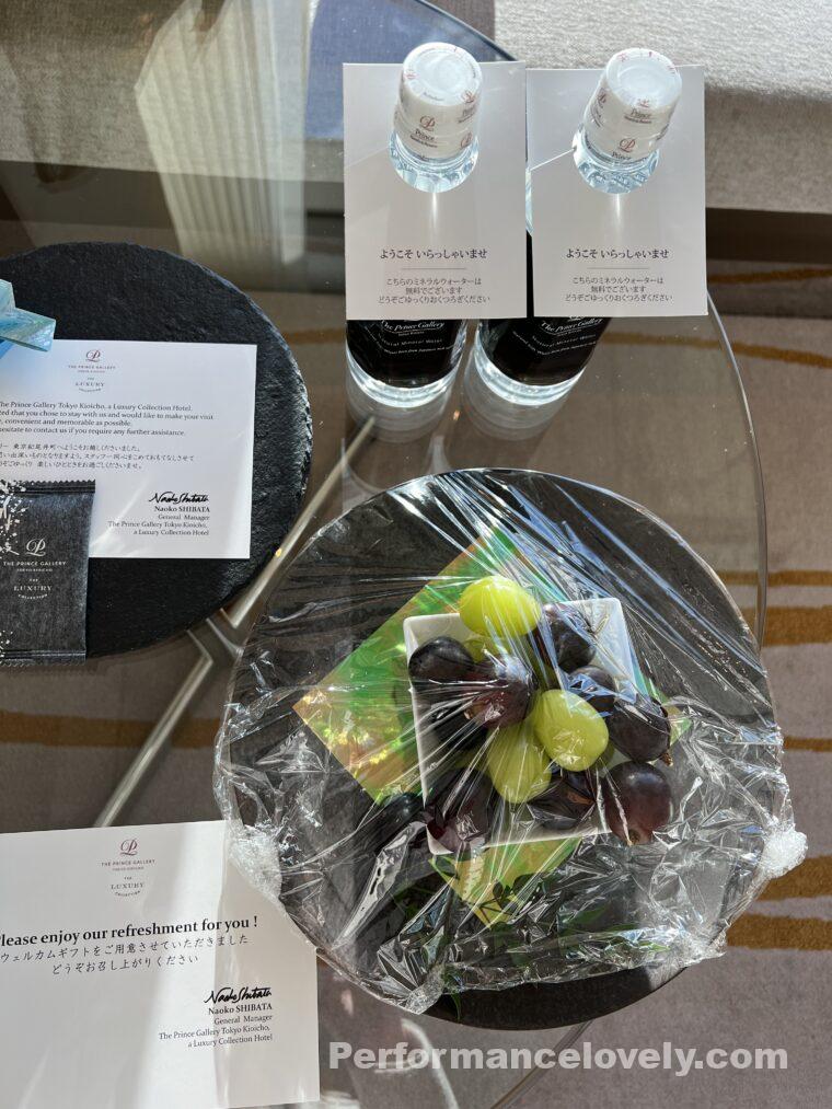 ウェルカムフルーツ付きのプランだったため、フルーツと無料のお水があります。中央にあるのはホテルのオリジナルのおせんべいです。