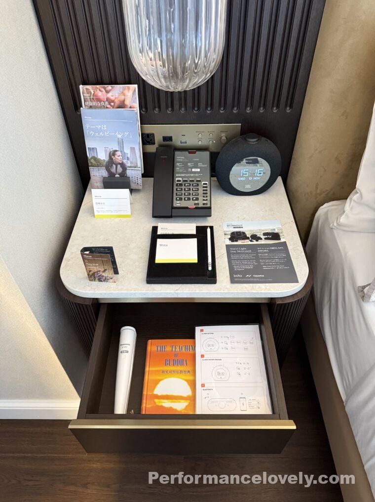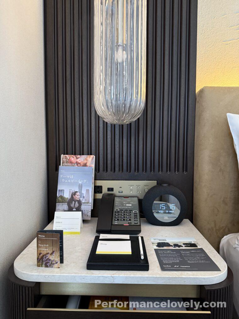 ベッドサイドのデスクには、アラーム時計、電話機、メモ帳のセットなどがありました。