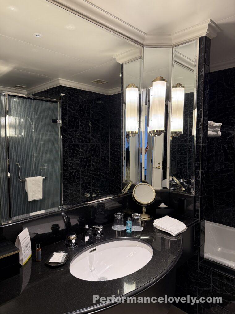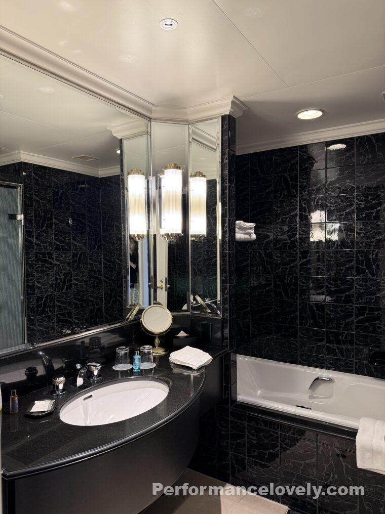 大理石風の黒を貴重としたバスルームで、とても重厚感がある雰囲気ですね。