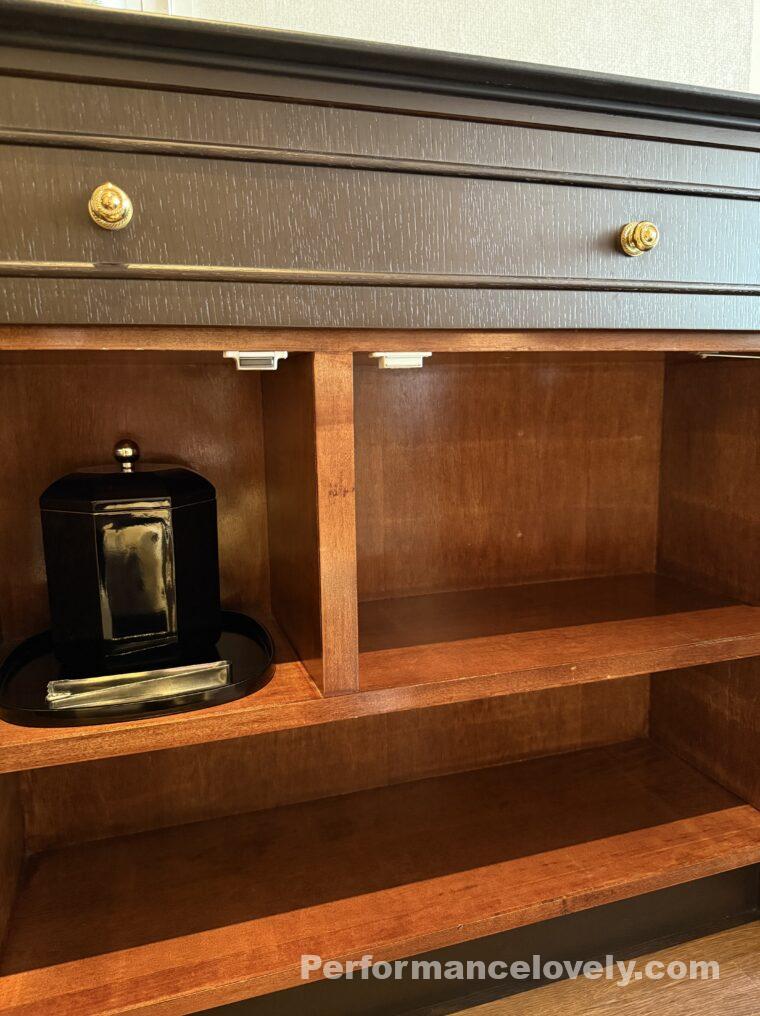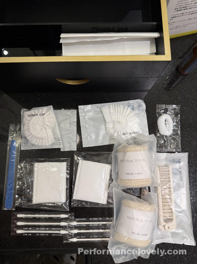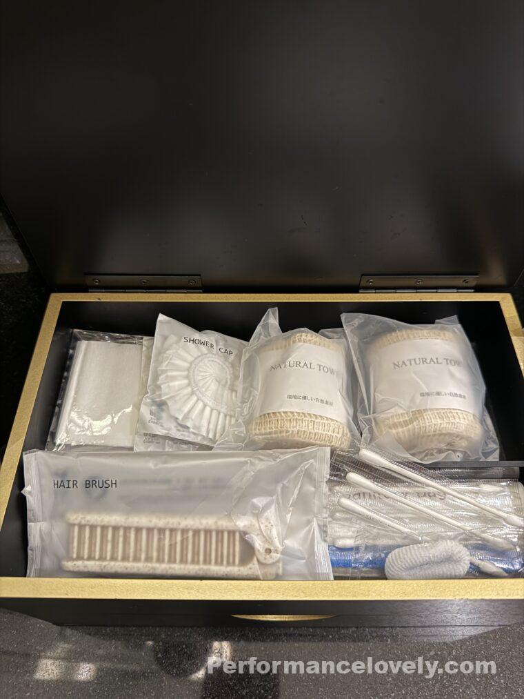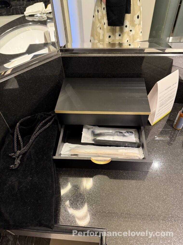 アメニティ類は洗面台横の黒いボックスの中に収納されています。