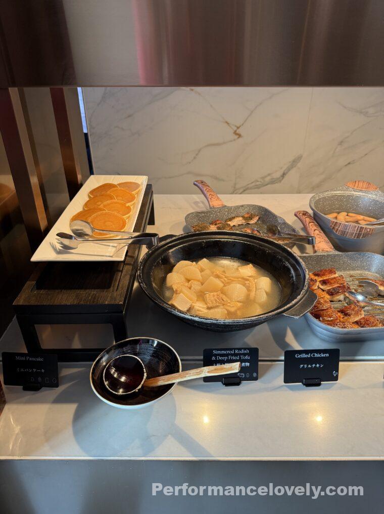パンケーキやグリルチキン、大根と厚揚げの煮物など温かいお食事も充実していました。