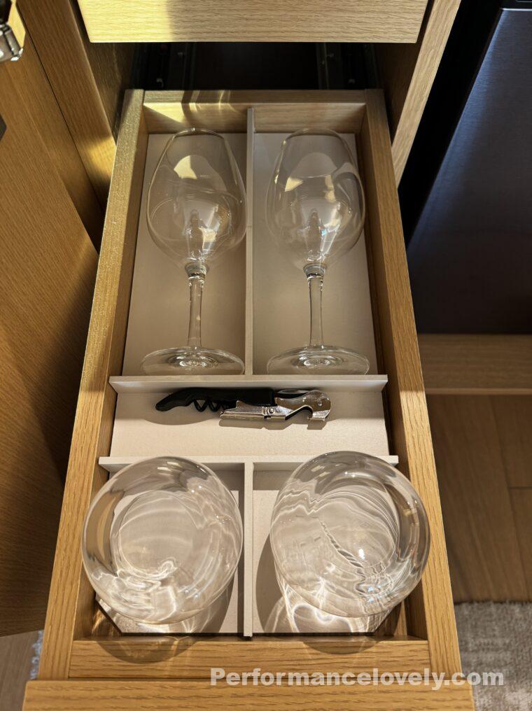 2段目にはワイングラスとワインオープナー、グラスがありました。