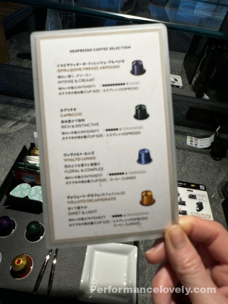 コーヒーカプセルはなんと4種類もテイストが用意されていました。ひとつはデキャフェ(カフェインレス)でした。
