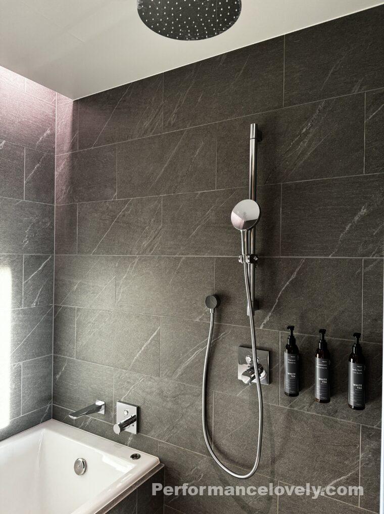 バスルームの浴室は洗い場が広く使いやすい設計です。なんなら椅子も用意されていて日本人仕様だと思いました。