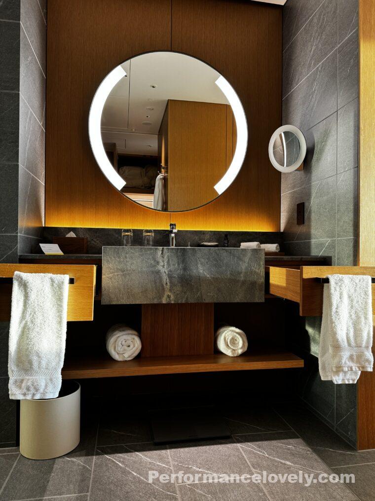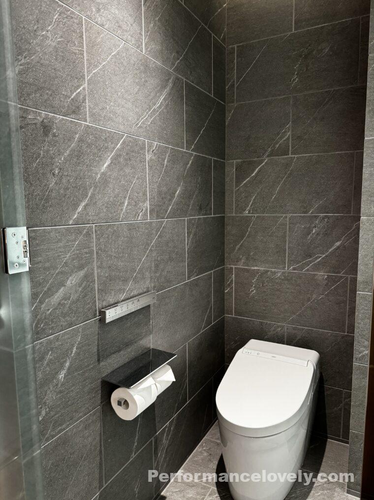ここからはバスルームです。バスルームはミニバーを背にしたスペースに設計されています。