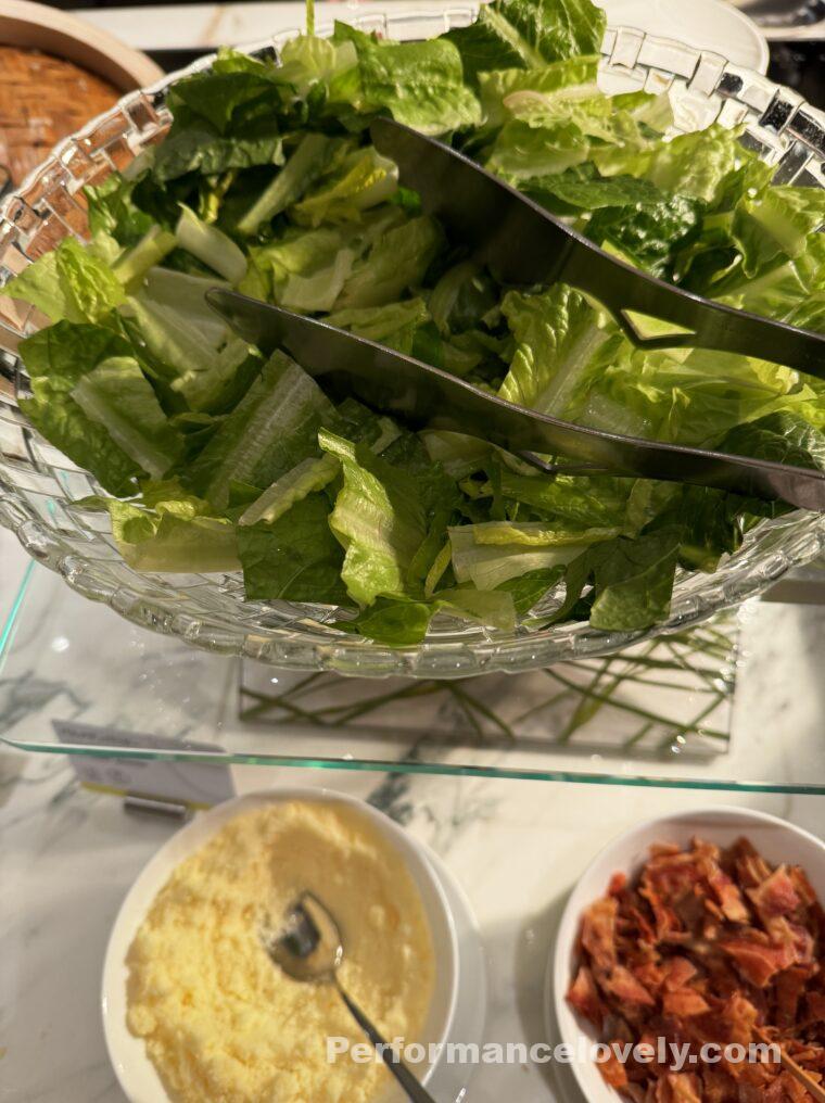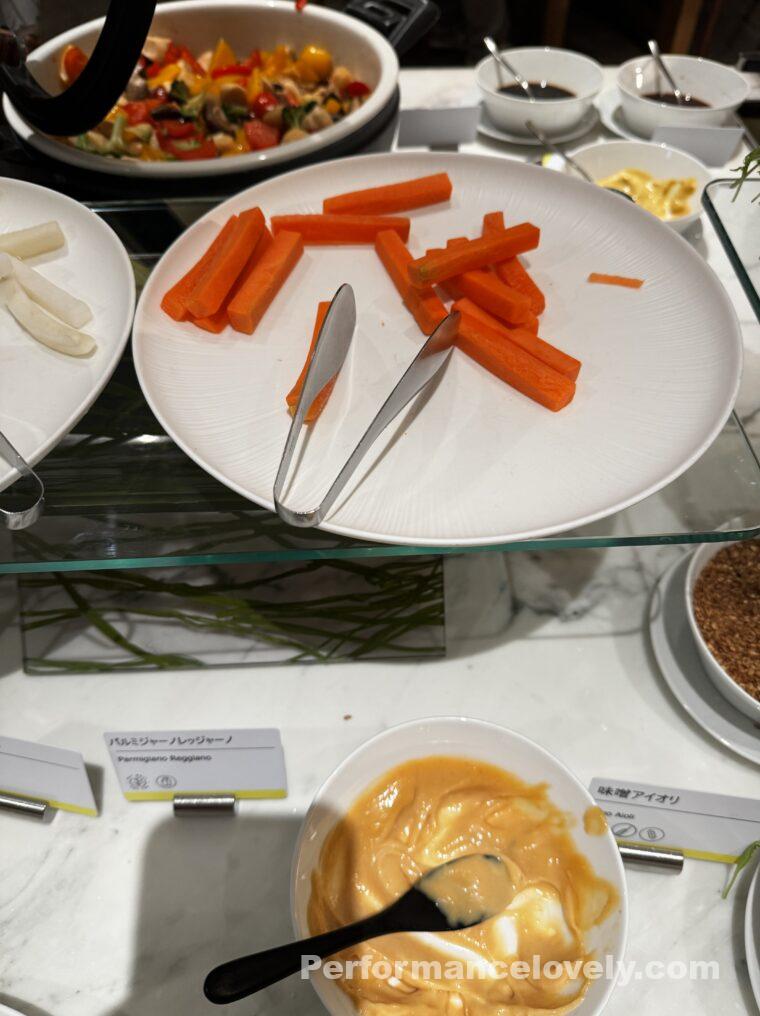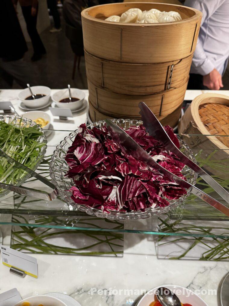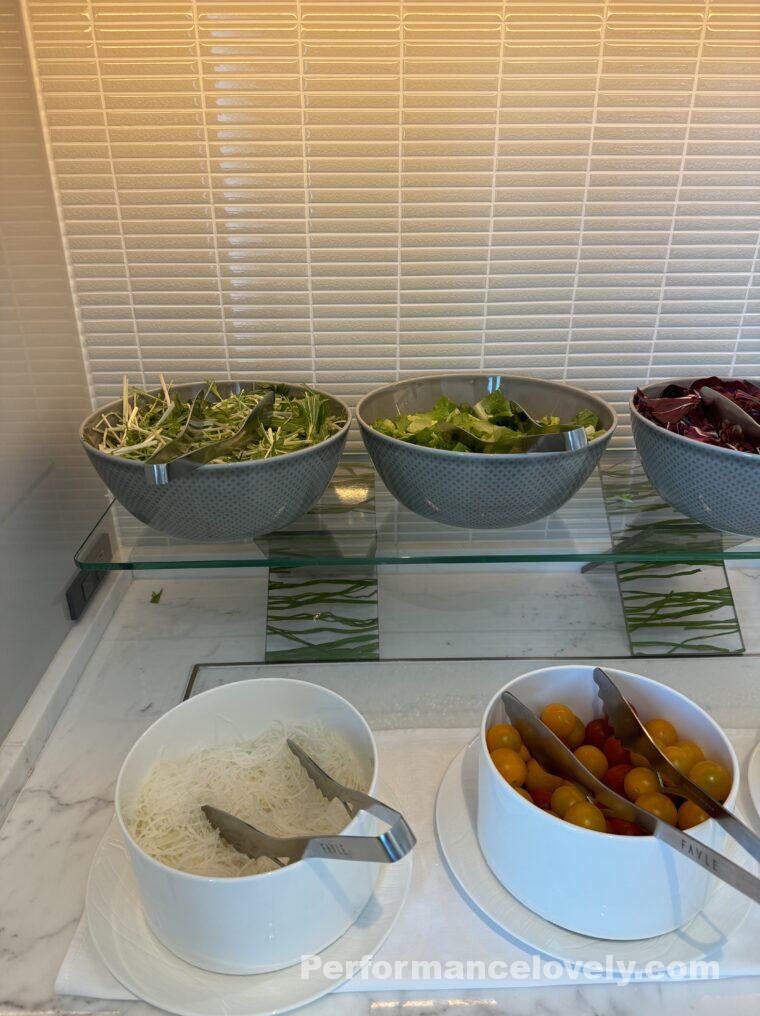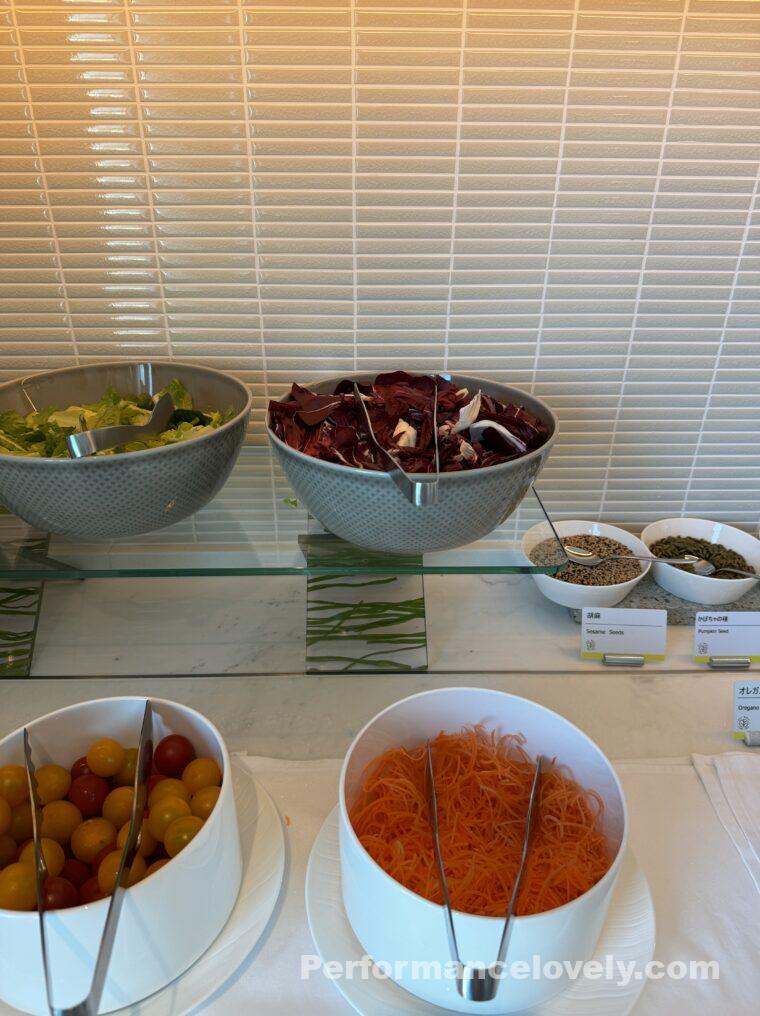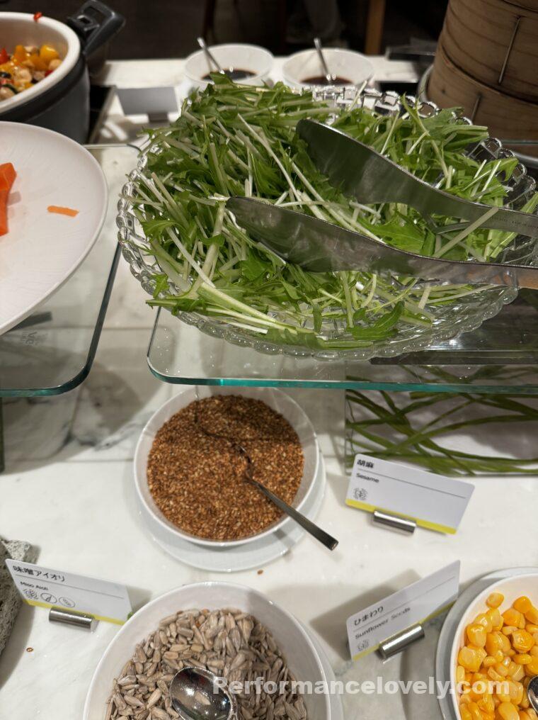 グリーンサラダ類はほぼカクテルタイムと同じでした。水菜、ロメインレタス、紫キャベツ、ミニトマトです。スライスされた大根もあります。