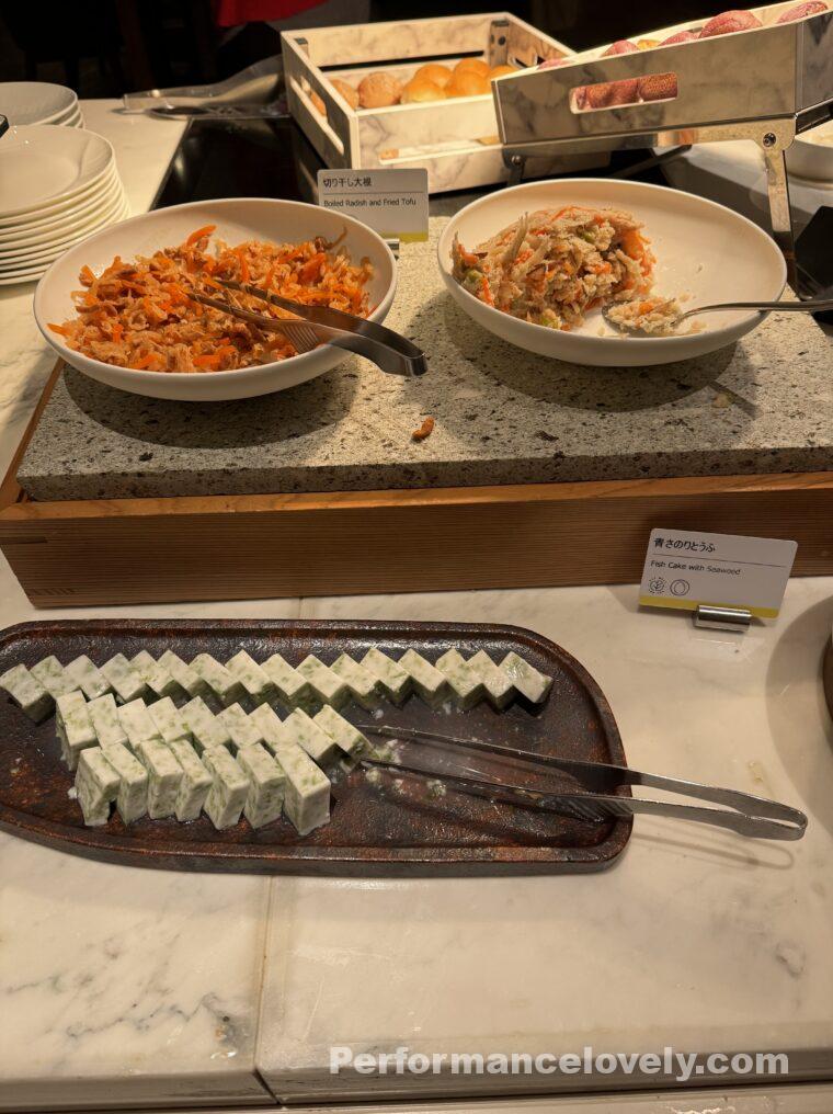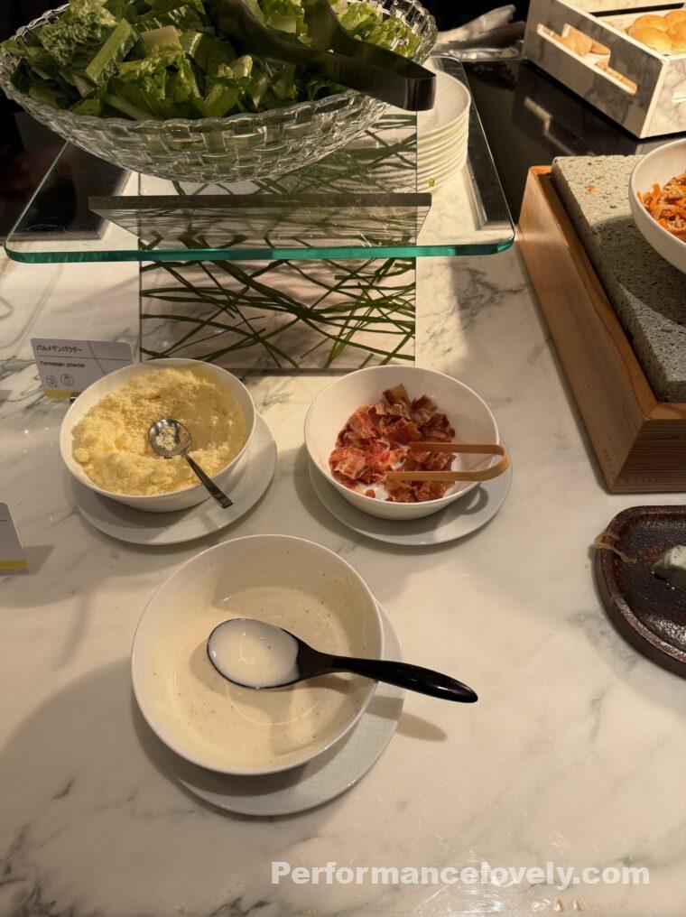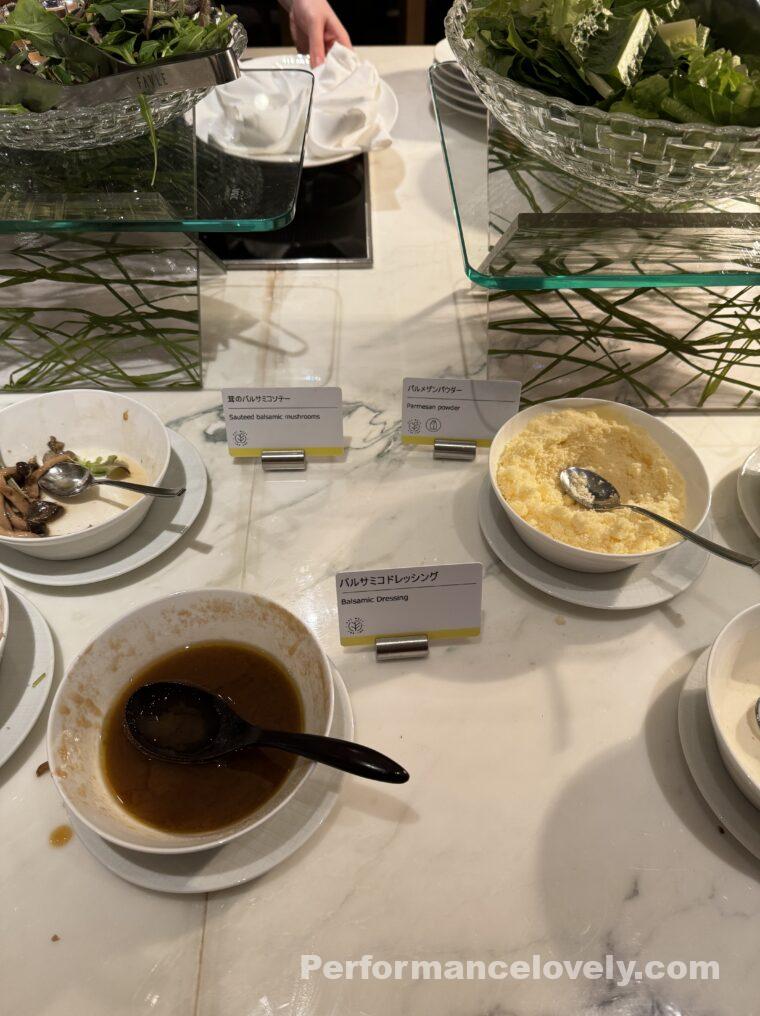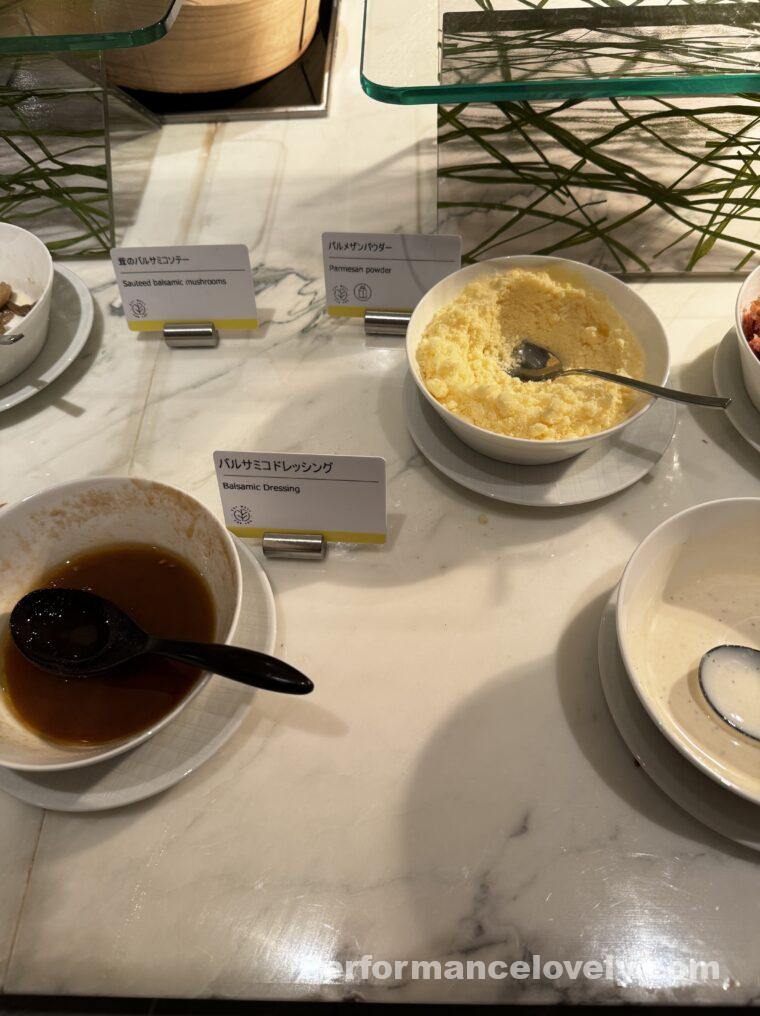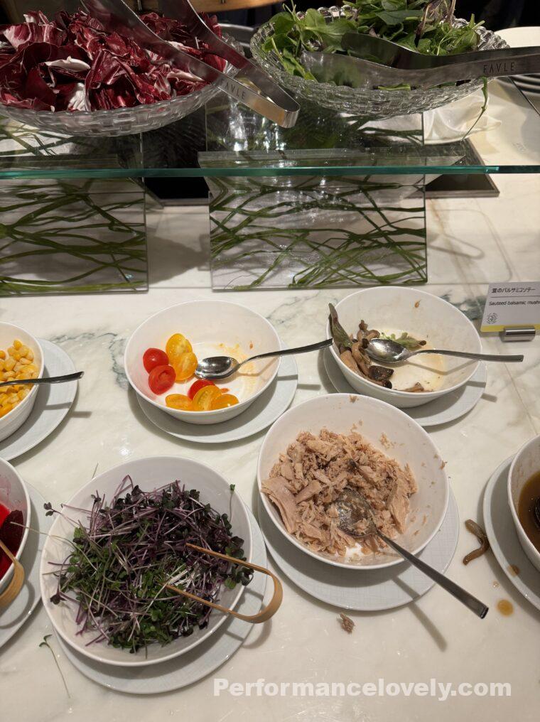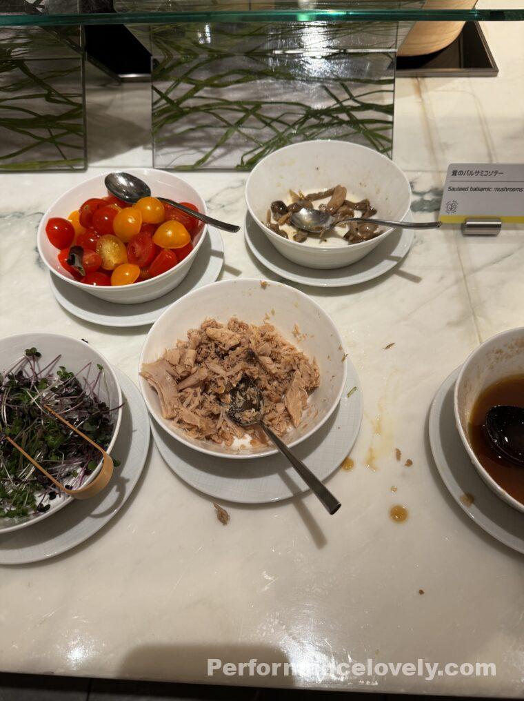 グリーンサラダ類はほぼカクテルタイムと同じでした。水菜、ロメインレタス、紫キャベツ、ミニトマトです。スライスされた大根もあります。