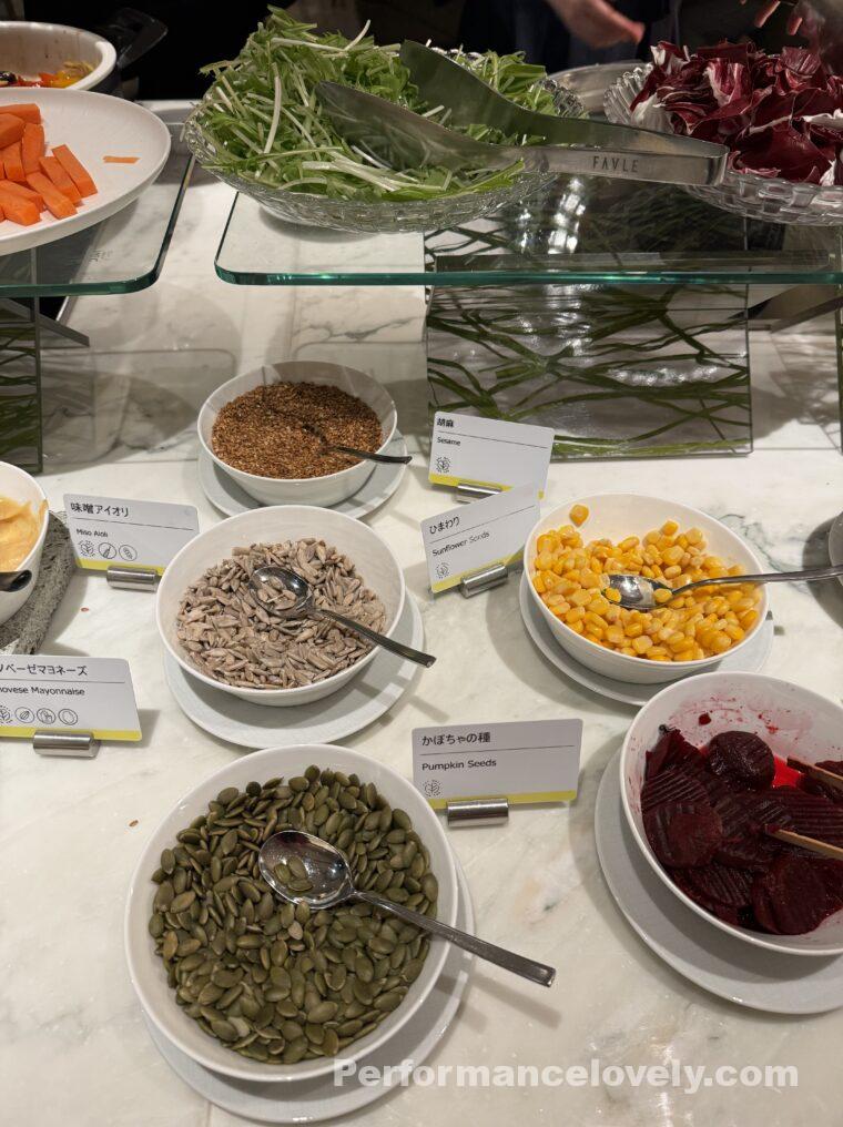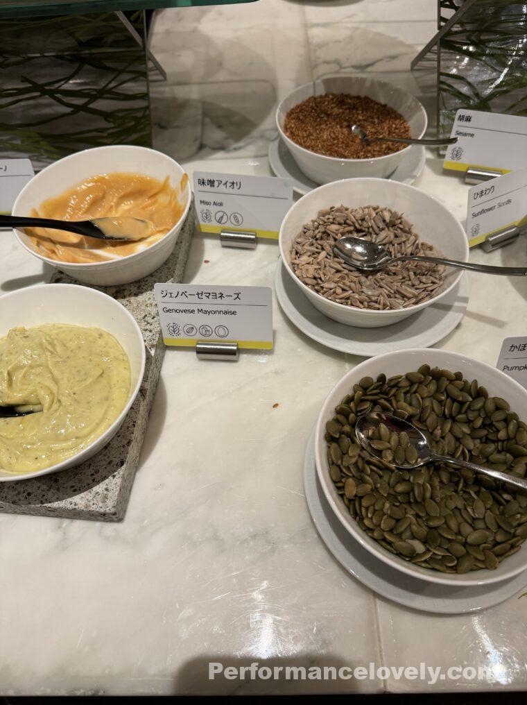 サラダのつけあわせとして、ごま、かぼちゃの種、ひまわりの種もあります。