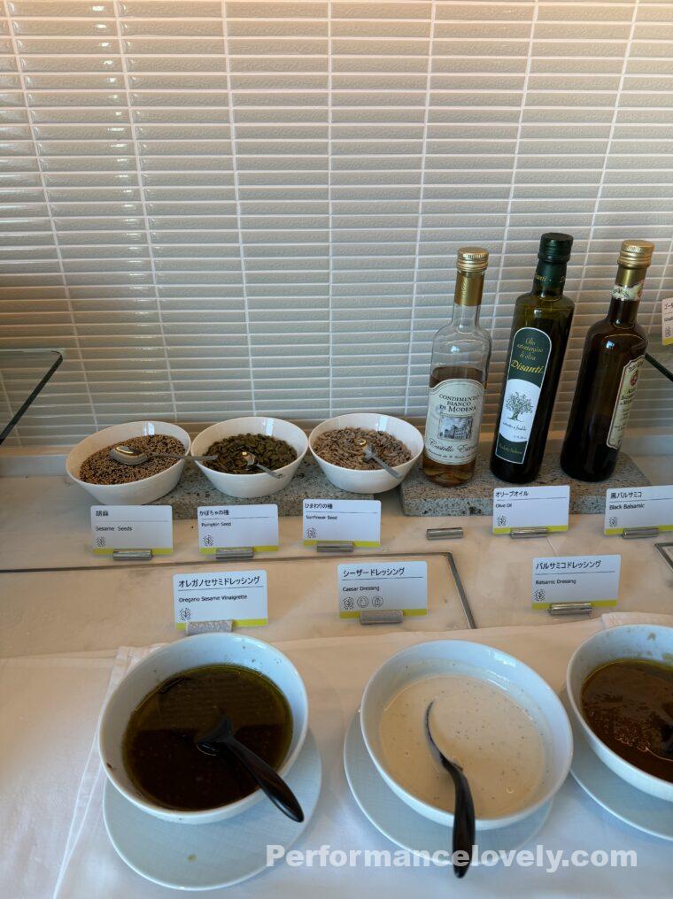 ドレッシングはオレガノセサミドレッシング、シーザードレッシング、バルサミコドレッシングです。